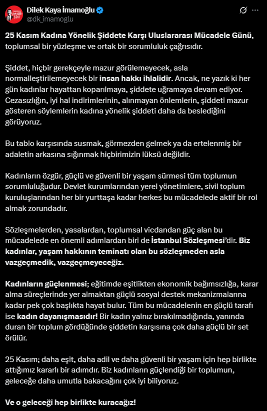 Mesajını bir çağrıyla tamamlayan İmamoğlu, “25 Kasım; daha eşit, daha adil ve daha güvenli bir yaşam için hep birlikte attığımız kararlı bir adımdır. Biz kadınların güçlendiği bir toplumun, geleceğe daha umutla bakacağını çok iyi biliyoruz. Ve o geleceği hep birlikte kuracağız” ifadelerini kullandı.
